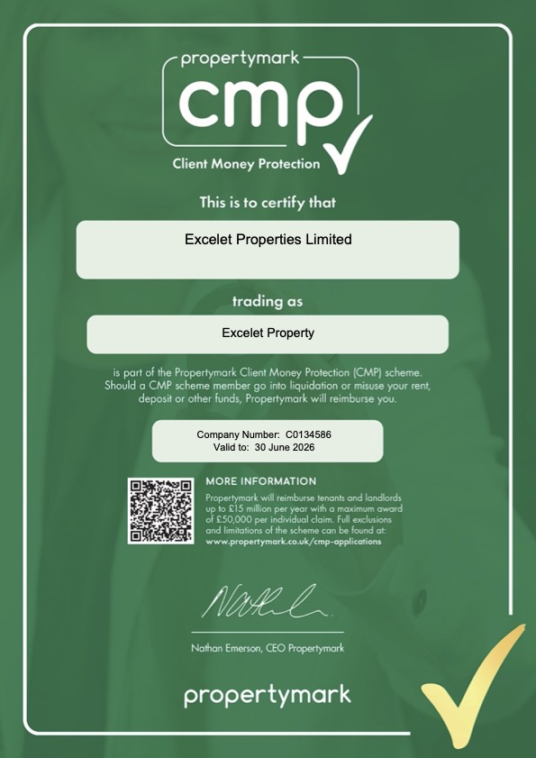 Excelet Properties Limited are a member of the client money protection (CMP) which is mandatory for all lettings agents. Client money protection (CMP) scheme protects clients money such as rent & deposit which are received by agents. Their schemes make sure landlords and tenants are compensated if an agent cannot repay their money, for example if an agent goes into administration.
