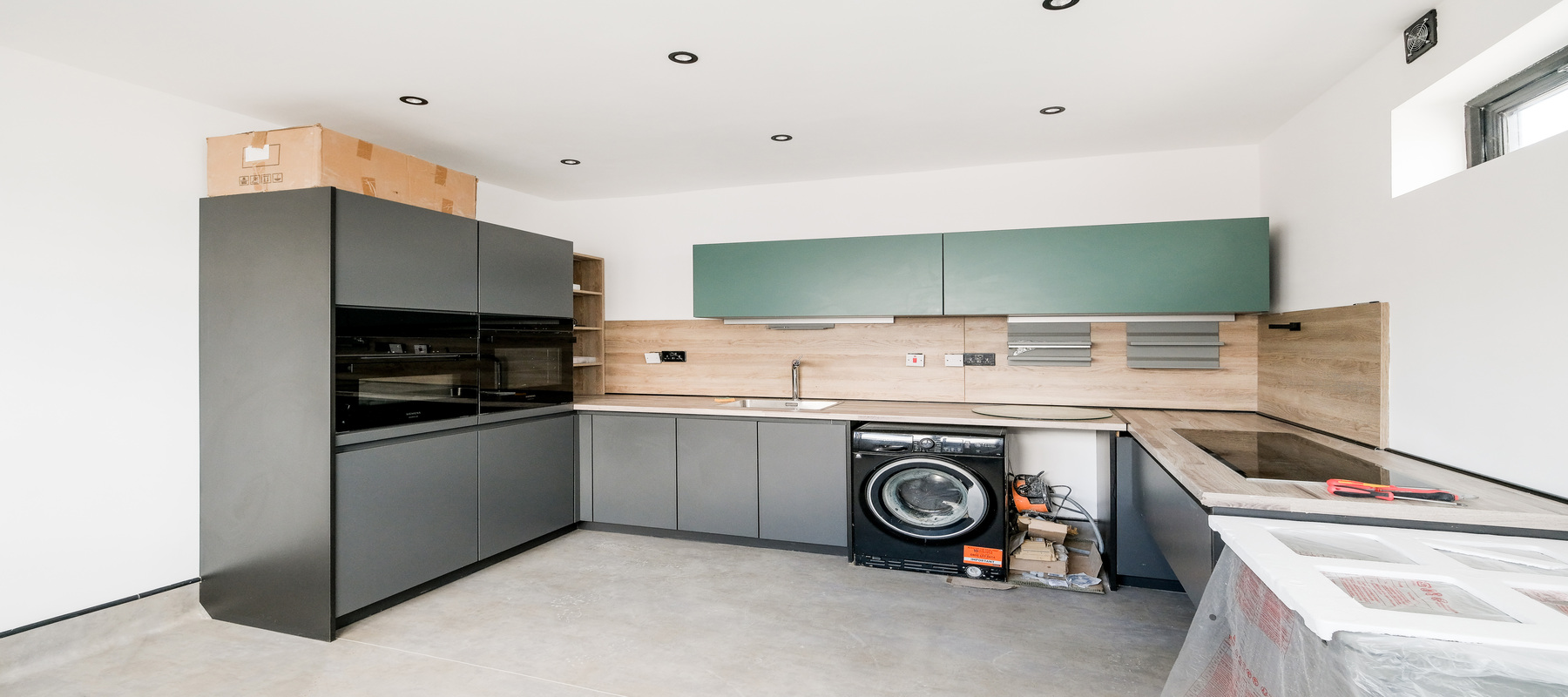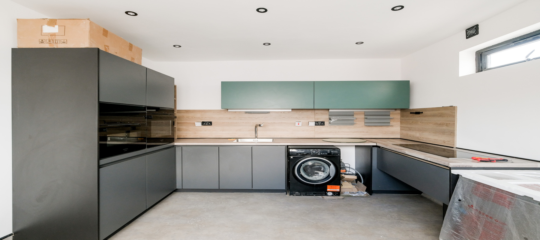 Brand‑new, kitchen fitted with high‑end integrated appliances, sleek cabinetry, modern lighting, and premium worktops